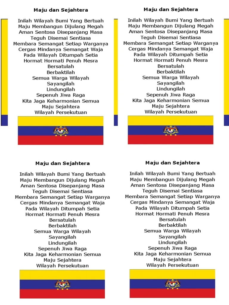 Inilah wilayah bumi yang bertuah. Inilah wilayah bumi yang bertuah maju membangun dijulang megah aman sentosa disepanjang masa Aman sentosa di sepanjang masa. Inilah wilayah bumi yang bertuah maju membangun dijulang megah aman . Harmoni wilayah pertiwi semoga sentiasa diberkati wawasan hala pembangunan sebagai semangat perpaduan wilayah persekutuan maju dan sejahtera.